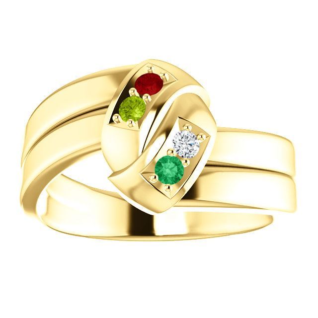 This ring is available in 10 or 14 karat rose, yellow or white gold with genuine or simulated stones.