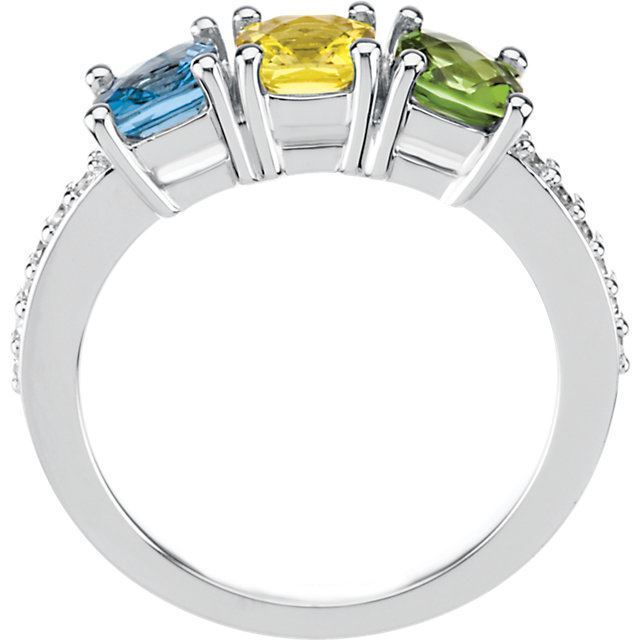 This ring is available in 10 or 14 karat yellow or white gold with genuine or simulated stones. Stone placement is from left to right.