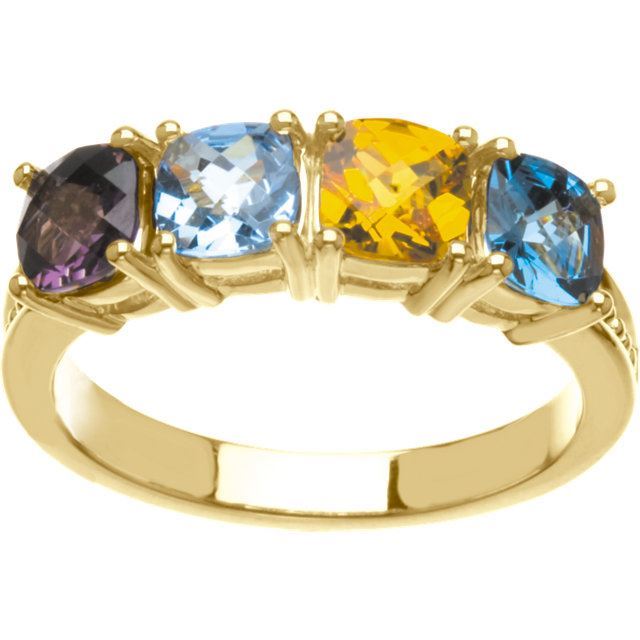 This ring is available in 10 or 14 karat yellow or white gold with genuine or simulated stones. Stone placement is from left to right.