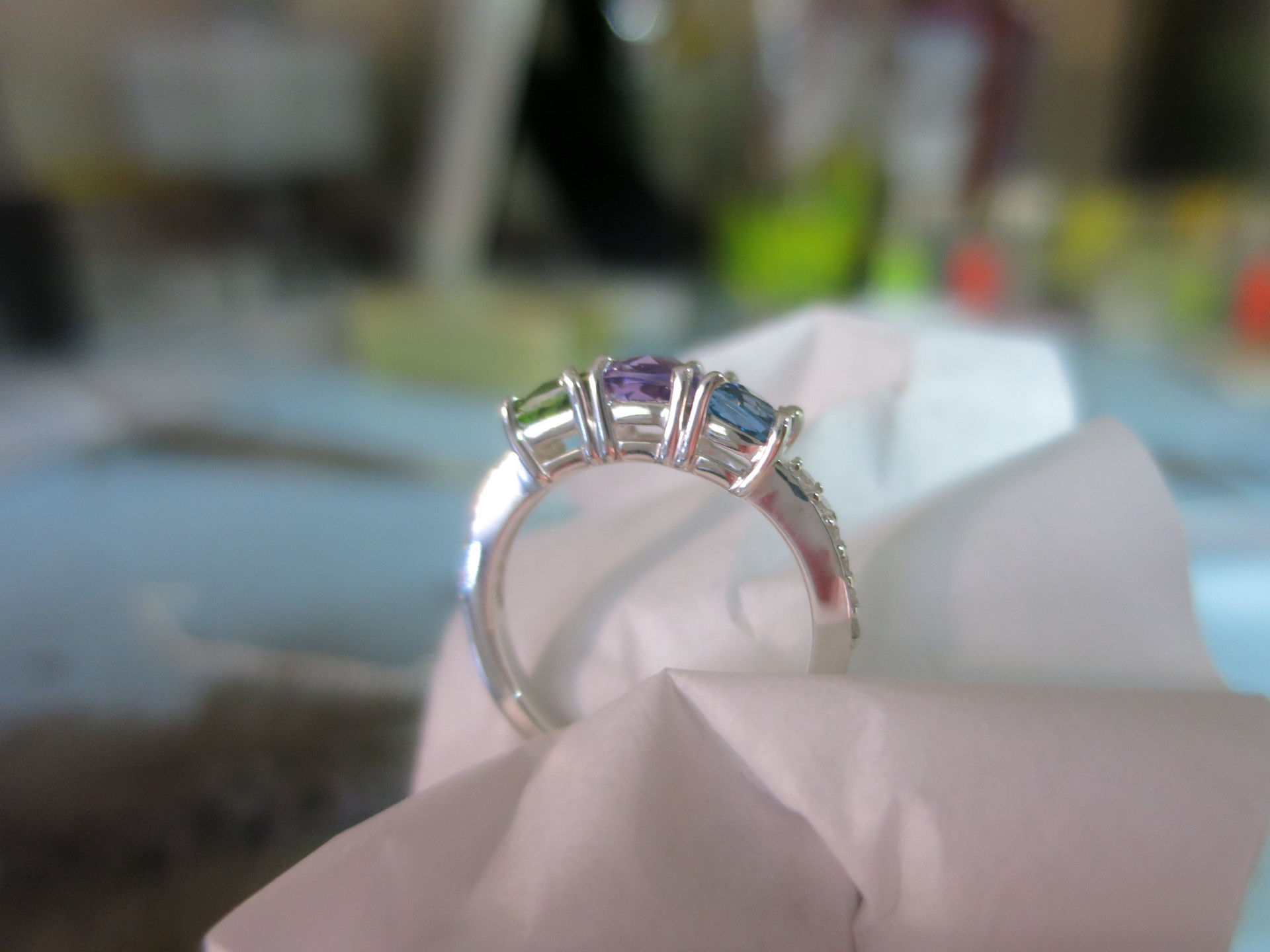 This ring is available in Sterling Silver with genuine or simulated stones. Stone placement is from left to right.